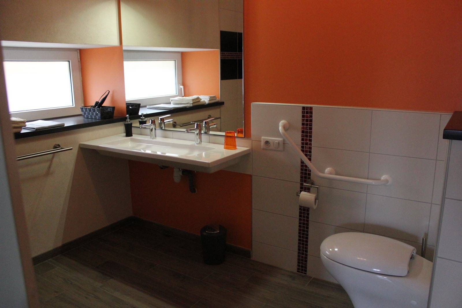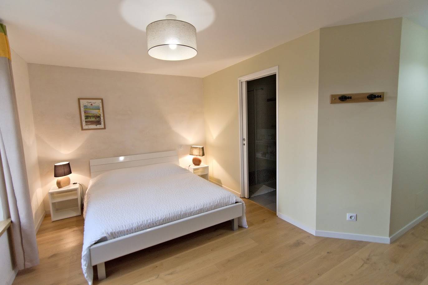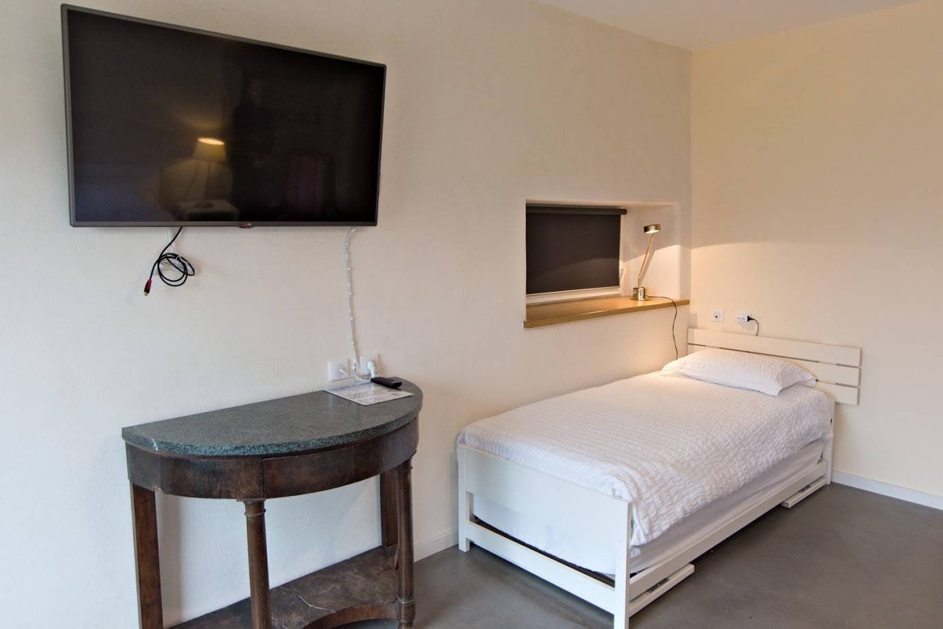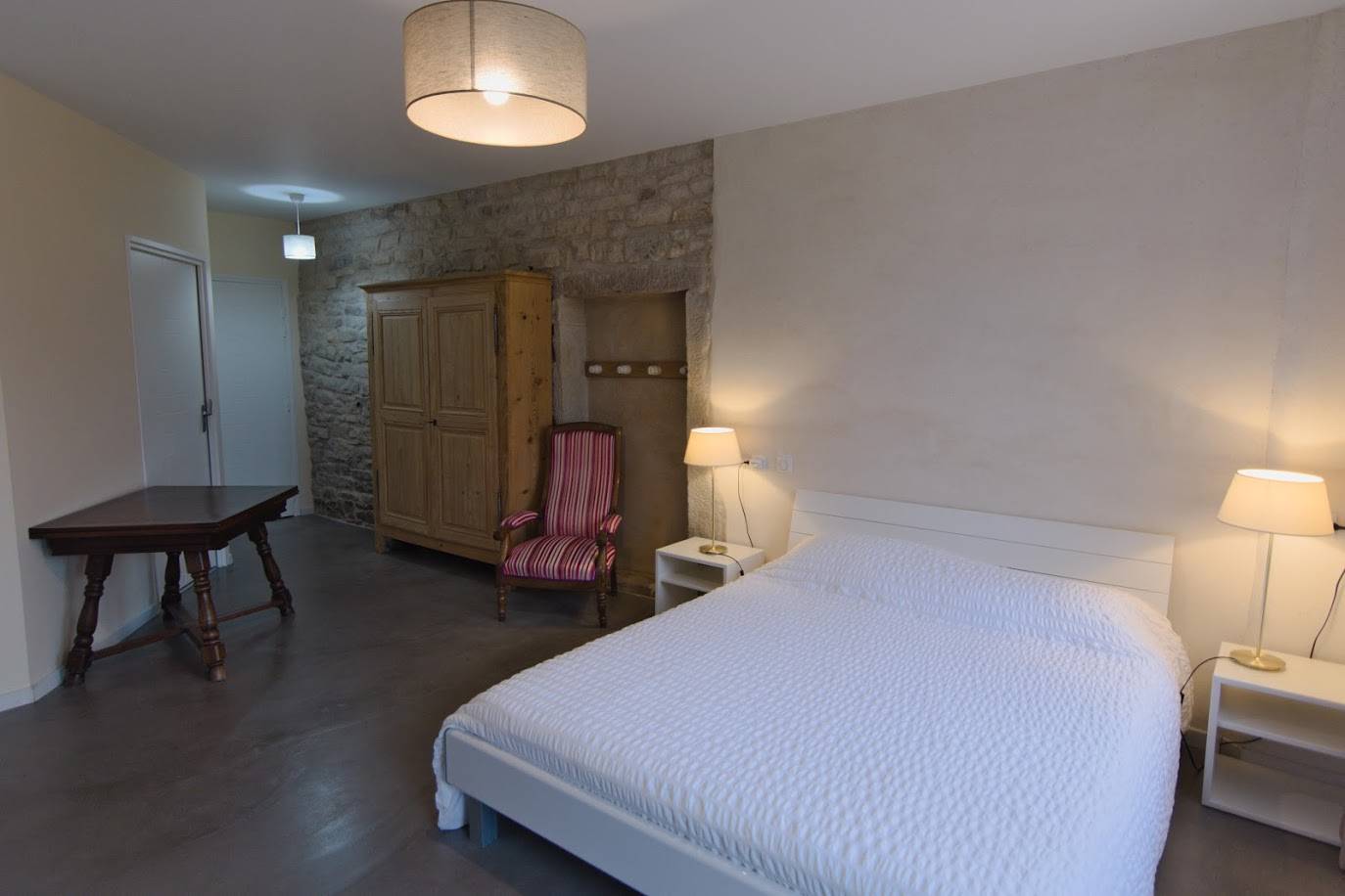 La chambre 5, d’une surface totale de 31m², a été spécialement conçue pour pouvoir accueillir les personnes à mobilité réduite. Elle est située au rez-de-chaussé et accessible par une rampe d’accès depuis le jardin clos. Les volets sont actionnés électriquement. Le sol en béton ciré donne une touche de modernité.