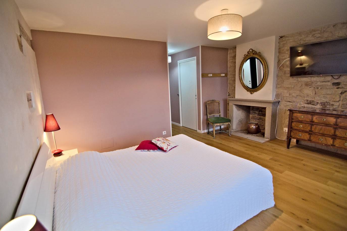 La chambre, d’une surface totale de 25m², est décorée d’une cheminée d’époque, d’un parquet en chêne et de murs en pierres apparentes. Pour encore plus d’espace, ses deux fenêtres ouvrent sur le jardin clos plein sud et sur la campagne environnante.