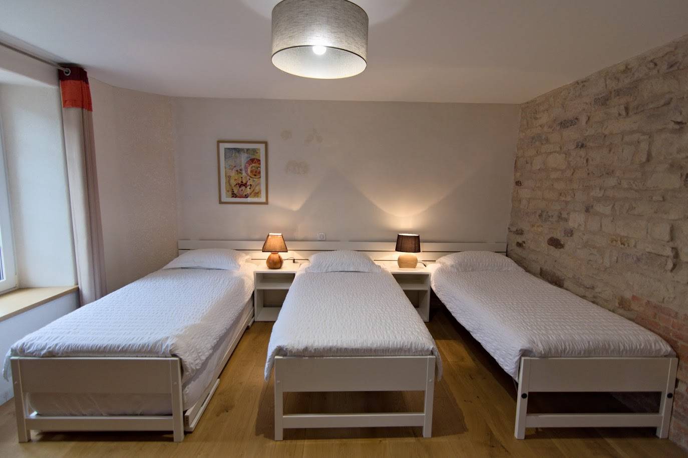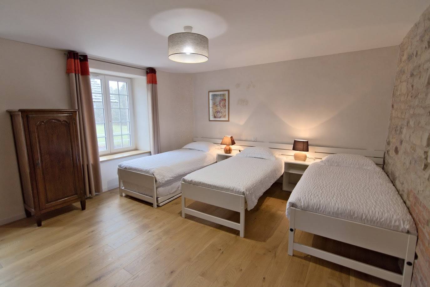 La chambre 3, d’une surface totale de 22m², donne sur le jardin clos plein sud et sur la campagne environnante. Le parquet en chêne et murs en pierres apparentes donnent une impression de sérénité. La salle d’eau avec sa fenêtre orientée ouest a une luminosité particulièrement agréable en soirée. Les parents apprécieront la suite familiale : couplage possible avec la chambre 4. Une chambre pour les parents, une pour les enfants ainsi deux salles de bains et deux WC, pratique non ?