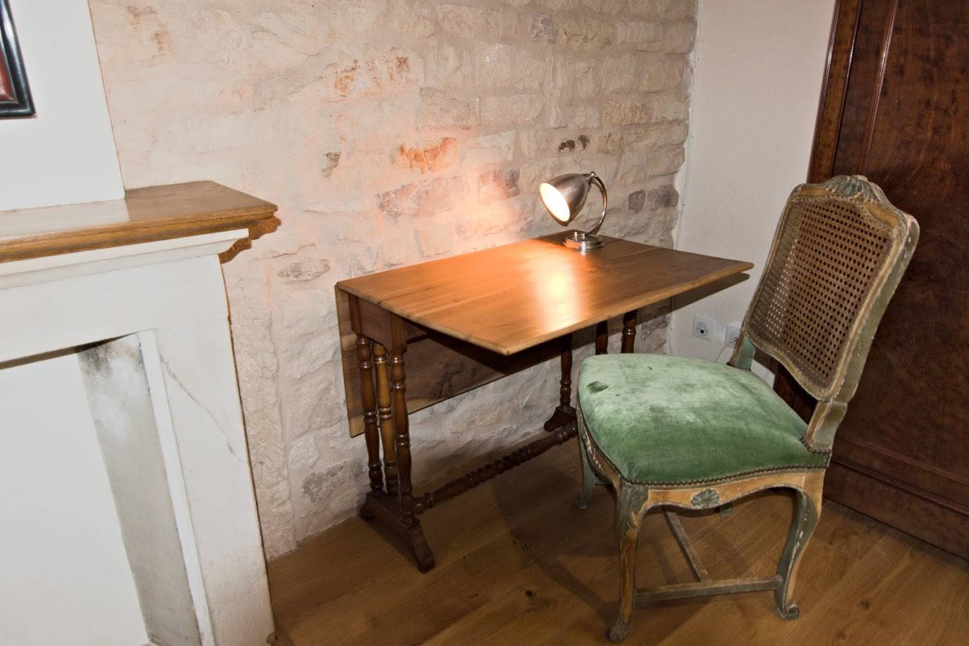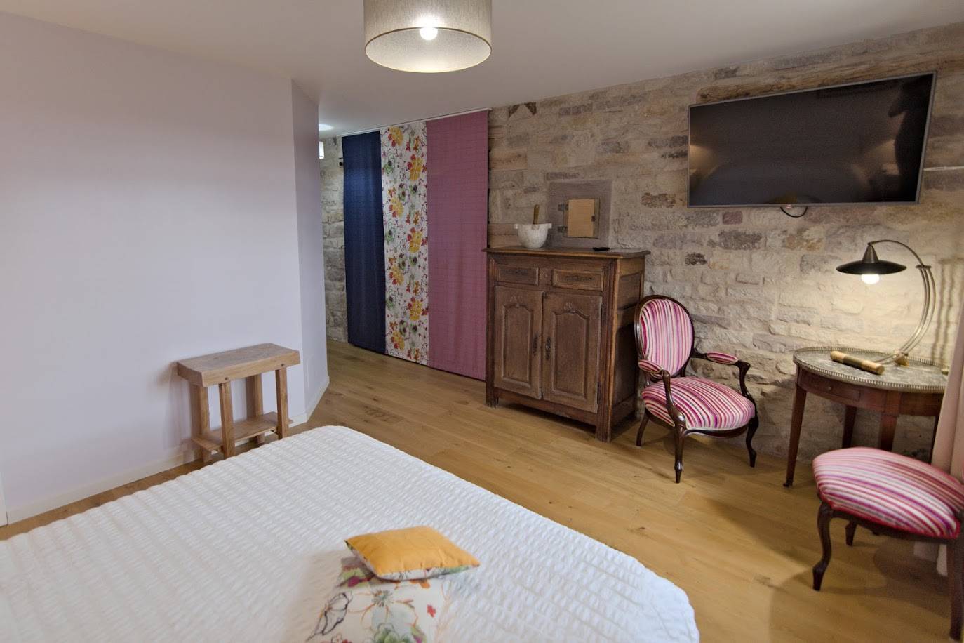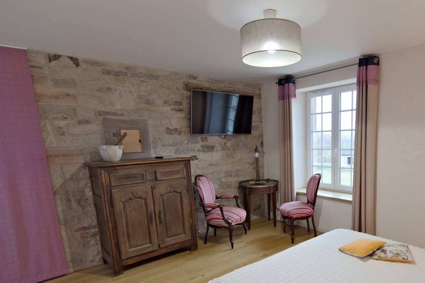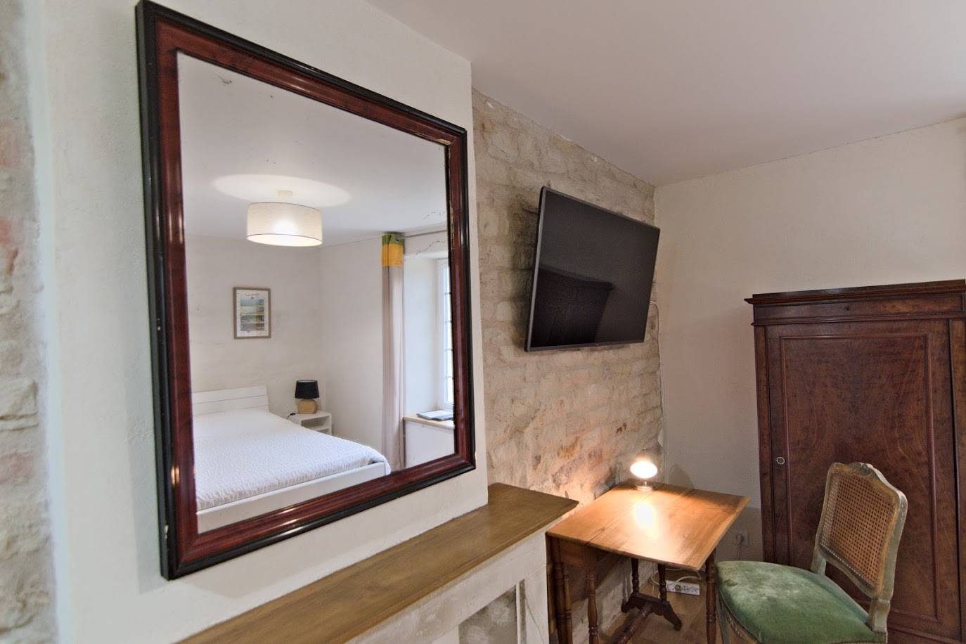 La chambre 1, d’une surface totale de 25m², est décorée d’une cheminée d’époque, d’un parquet en chêne et de murs en pierres apparentes. Pour encore plus d’espace, ses deux fenêtres ouvrent sur le jardin clos plein sud et sur la campagne environnante.